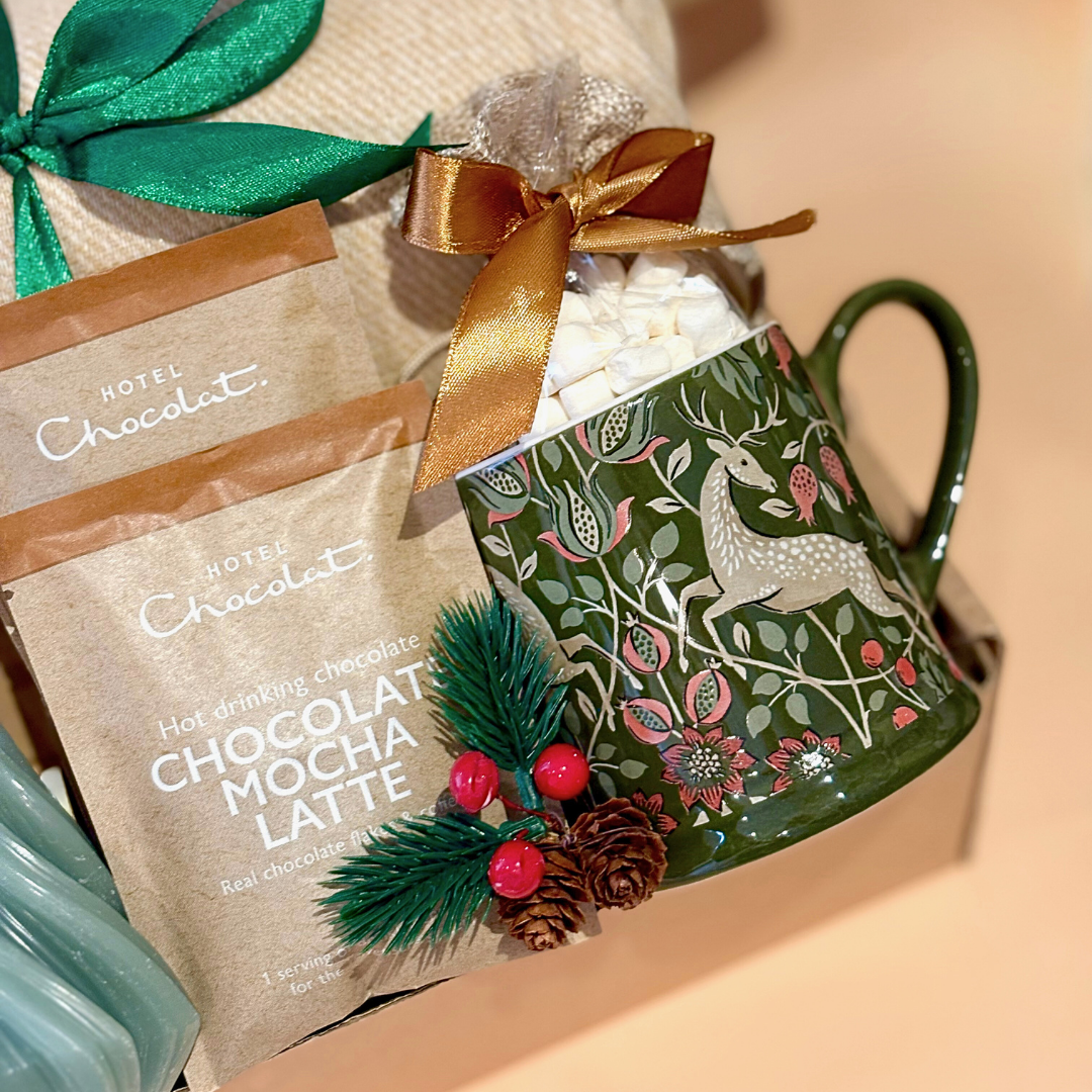 Ceramic Forest Mug – Deep green mug with a whimsical holiday motif, ideal for sipping cocoa